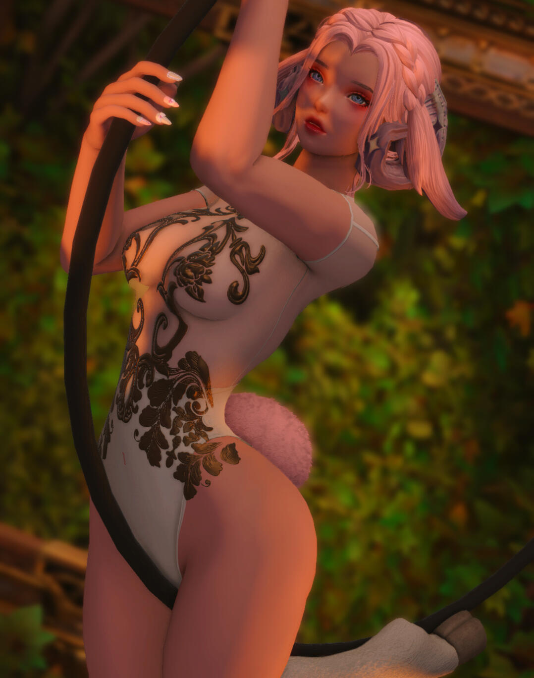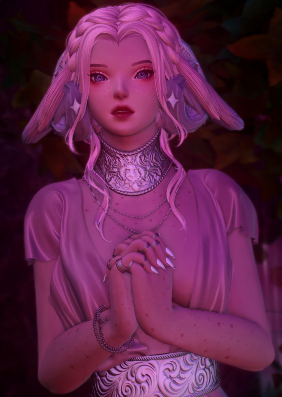 Jingyi has a strange set of horns on her head, nothing like what you might have seen on a normal Au'Ra, as well as also having hooves instead of feet, long soft ears, and a fluffy tail.