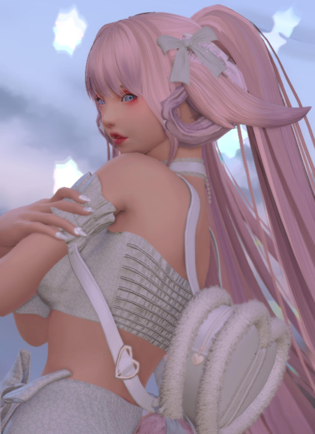 Description: Pink and purple hair. Light pink skin. Blue eyes. White colored ram horns on either side of her face with floppy lamb ears and a round, pink tail. Toned body. Wears whites and pastels.